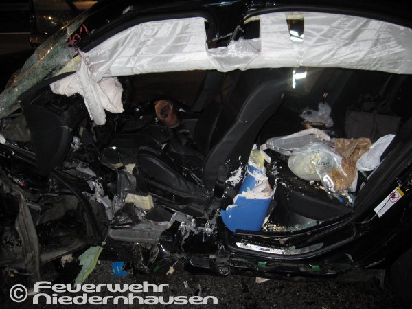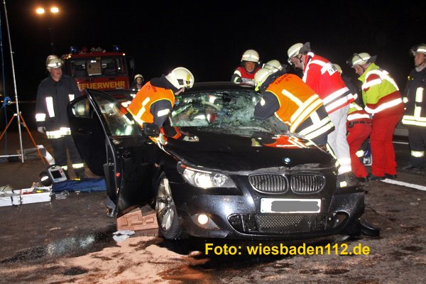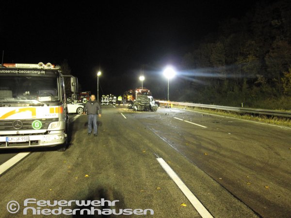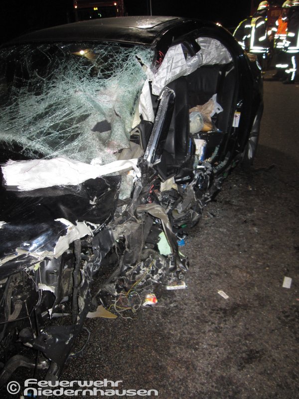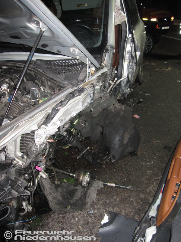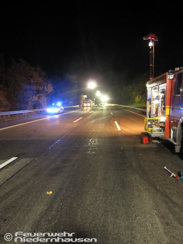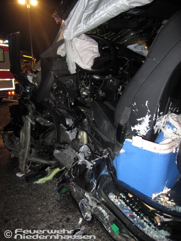 Die Ermittlungen zum Unfallgeschehen sind sehr schwierig, vermutlich hat sich der Unfall wie folgt zugetragen. Der mutmaßliche Unfallverursacher befuhr die A3 in Richtung Köln zwischen den Anschlußstellen Niedernhausen und Idstein wendete er sein Fahrzeug auf der Autobahn und fuhr von nun an als Geisterfahrer. Er kollidierte zunächst mit einem BMW aus Duisburg. Der Fahrer des BMW wurde im Fahrzeug eingeklemmt. Anschliessend fuhr bzw. schleudete der Geisterfahrer weitere 200m bis er mit 2 weiteren Fahrzeugen kollidierte. Die Insassen dieser Fahrzeug wurden schwer bzw. leicht verletzt, waren aber nicht im Fahrzeug eingeklemmt. Diese Unfallstelle wurde von der Feuerwehr Königshofen übernommen, die Feuerwehr Niedernhausen übernahm die Einsatzstelle mit dem eingeklemmten BMW Fahrer. Die Rettung des eingeklemmten Fahrers gestaltete sich schwierig, da das Fahrzeug sehr stark deformiert war und der Fahrer im Bereich der Beine eingeklemmt war. Noch während der Rettungsmaßnahmen wurde der Fahrer von Kräften der Feuerwehr und des ASB Niedernhausen reanimiert, leider verstarb er kurz darauf.