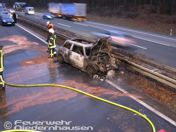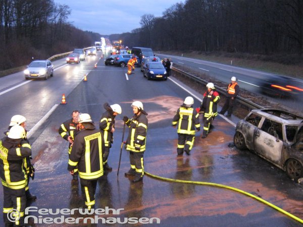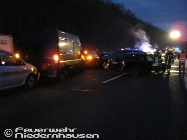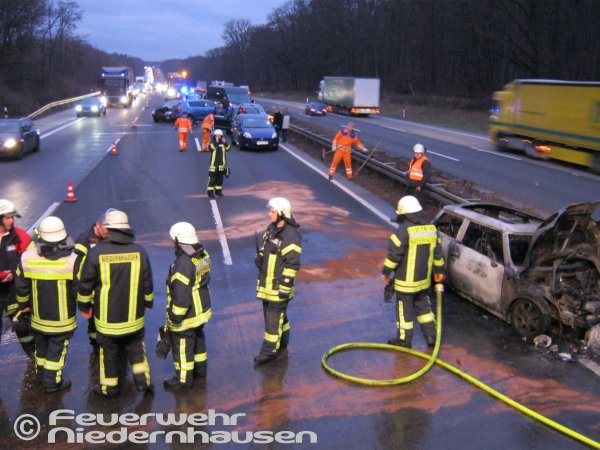 Nach einem Verkehrsunfall mit mehreren PKW, fing ein Fahrzeug Feuer und brannte beim Eintreffen der Feuerwehr in voller Ausdehnung. Der Fahrer konnte glücklicherweise vorher das Fahrzeug verlassen. Der Brand wurde von einem Trupp unter schwerem Atemschutz mit 2 C-Rohren gelöscht. Bei den restlichen Fahrzeugen mussten nur die Batterien abgeklemmt werden.