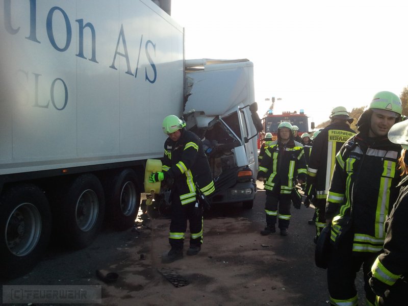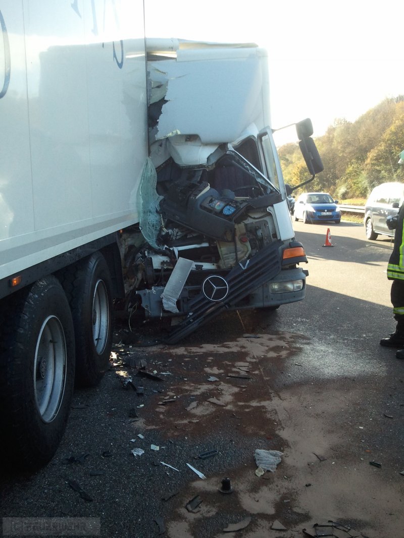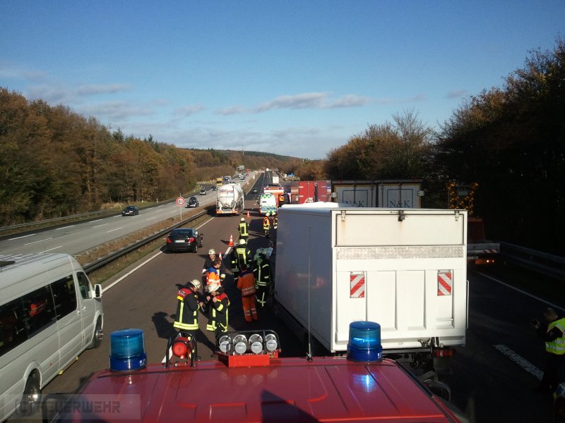 Zusammen mit den Kameraden aus Königshofen wurde die Feuerwehr Niedernhausen zu einem schweren Verkehrsunfall mit 3 LKW auf die A3 Richtung Idstein gerufen. Das Führerhaus des Unfallfahrzeugs war vollständig defomiert, allerdings konnte die eingeklemmte Person bereits vor Ankunft der Feuerwehr befreit werden, sodass nur auslaufende Flüssigkeiten aufgefangen und Absperrmaßnahmen durchgeführt wurden. Zeitweise war die Fahrbahn nur auf einem Fahrstreifen befahrbar. Die Einsatzstelle wurde im Anschluß an die Polizei und die Autobahnmeisterei übergeben.