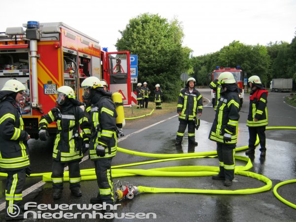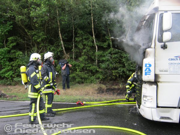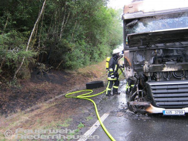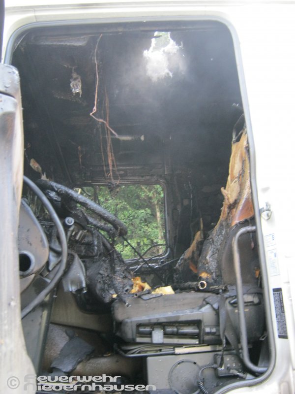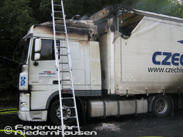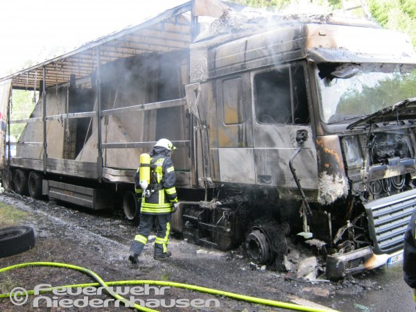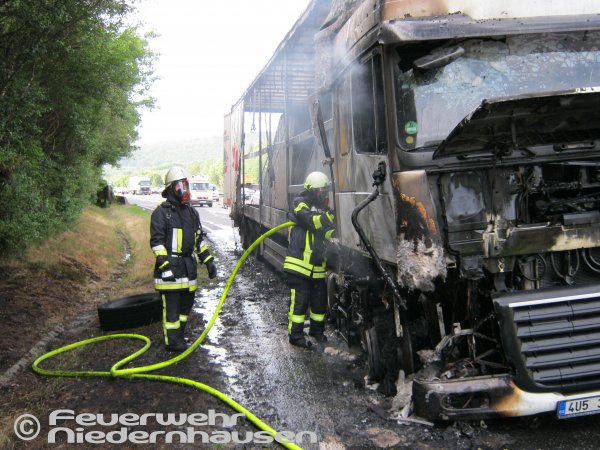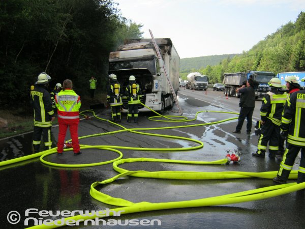 Gemeldet wurde durch die Leitstelle ein brennender LKW auf der A3 in der Ausfahrt zum Parkplatz Theisstal. Bereits auf der Anfahrt war die Rauchsäule zu sehen. Die Zugmaschine brannte in voller Ausdehnung und das Feuer hatte bereits auf den Auflieger übergegriffen. Im Einsatz waren 4 Mann unter Atemschutz und zwei C-Rohre. Die ebenfalls alarmierte Feuerwehr Königshofen saugte dann noch Dieselreste aus dem Tank ab. Die Feuerwehr Idstein unterstützte mit dem GTLF. Insgesamt waren 5.600 Liter Wasser nötig um den Brand zu löschen.