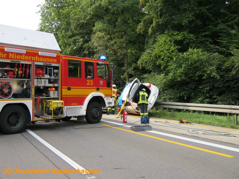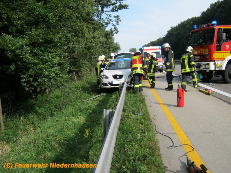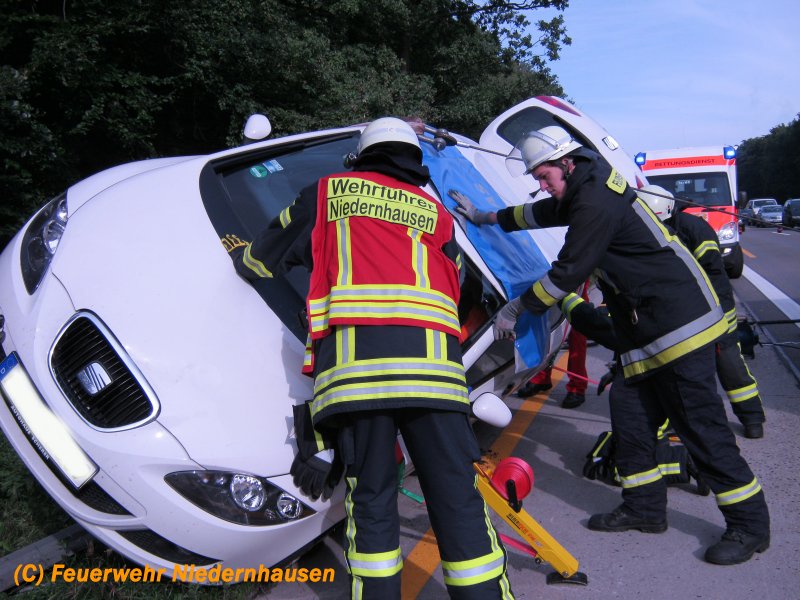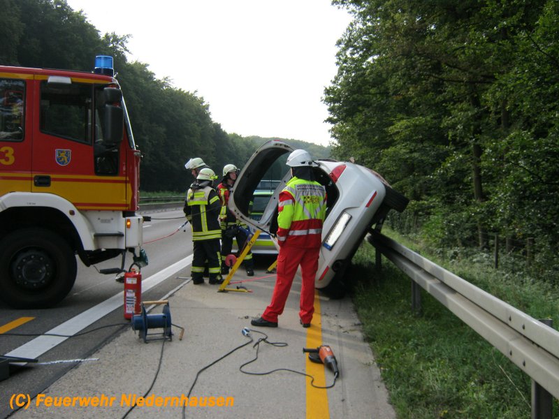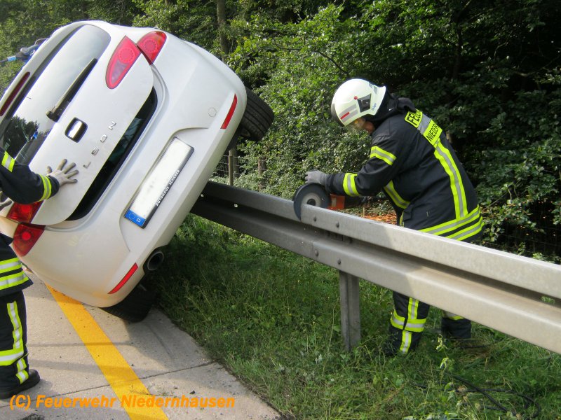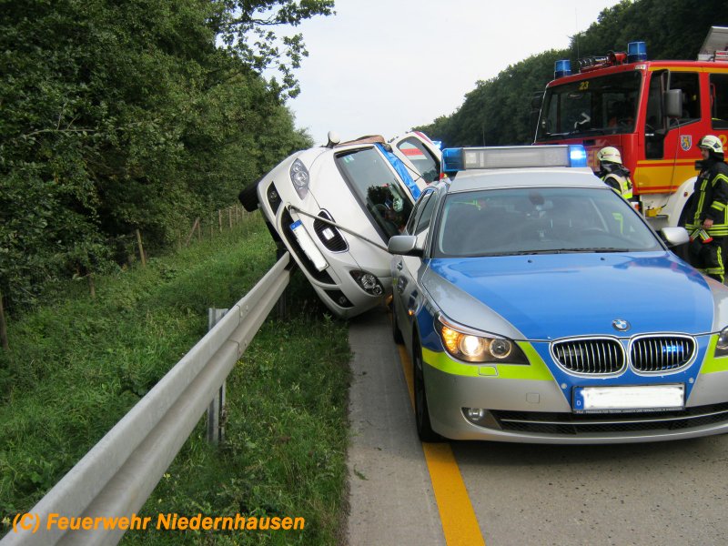 Kurz vor unserer Samstagsübung wurden wir auf die A3 gerufen, da dort 2 Personen im Fahrzeug eingeschlossen waren. Eine Polizeistreife wollte ein Fahrzeug, besetzt mit 2 Frauen, aus der Baustelle schleppen, vermutlich um schnellstmöglich wieder alle Fahrspuren für den Verkehr frei zu machen. Beim Abschleppen rastete aber beim Fahrzeug der beiden Frauen das Lenkradschloß ein, worauf der PKW nach rechts von der Fahrbahn abkam, die dort beginnende Leitplanke hinauf fuhr und auf der Leitplanke zum Stehen kam. Die Fahrerin konnte aufgrund der Schräglage die Tür nicht mehr öffnen und die Beifahrerin war wegen eines eingegipsten Beines stark behindert. Wir sicherten das Fahrzeug zunächst mit dem Stab-Fast System gegen Umstürzen, dann trennten wir die Leitplanke auf und ließen das Fahrzeug dann vorsichtig mit der Seilwinde des HTLF ab, bis es wieder auf allen vier Rädern stand. Danach konnte die Frauen unverletzt das Fahrzeug verlassen. Die A3 musste für die Bergung ca. 60 Minuten voll gesperrt werden
