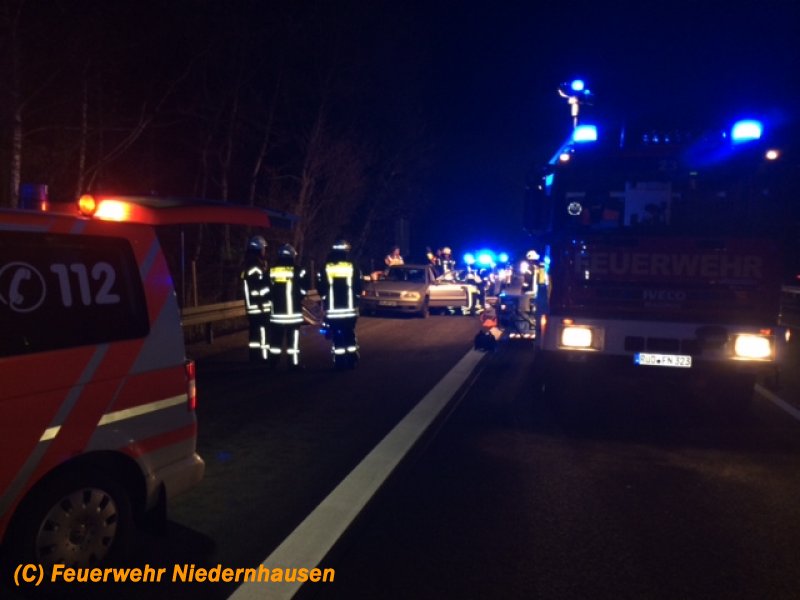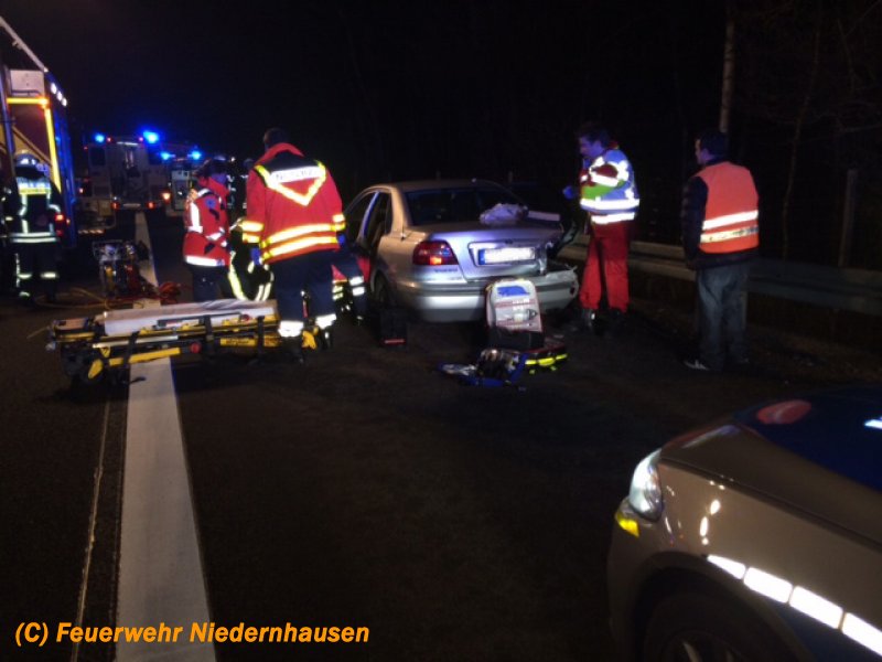 Gemeldet wurde ein Verkehrsunfall mit eingeklemmter Person zwischen Niedernhausen und Idstein. Von der Rettungwagenbesatzung, die diesen Bereich zuerst befuhr, konnte kein VU ausfindig gemacht werden, worauf der Einsatzleitwagen die Strecke Richtung Medenbach absuchte. Auf der Gegenfahrbahn wurde dann ein Unfallfahrzeug gesichtet und die Meldung an die zuständige Leitstelle des Main-Taunus-Kreises weitergegeben, die sofort eigene Kräfte alarmierte. An der Einsatzstelle eingetroffen, stellt man 5 beteiligte Personen fest, eine Frau mit einer möglichen Wirbelsäulenverletzung, die noch im Fahrzeug saß. Der Notarzt forderte, dass zur Rettung der Person eine Türe des Fahrzeugs entfernt wird. Auf Anforderung des Stadtbrandinspektors Hofheim wurde dies von der Besatzung des HTLF, der sich auf der Rückfahrt befand, mit hydraulischem Rettungsgerät erledigt. Die Kräfte der Feuerwehr Hofheim übernahmen Absicherung der Einsatzstelle und die Sicherstellung des Brandschutzes.