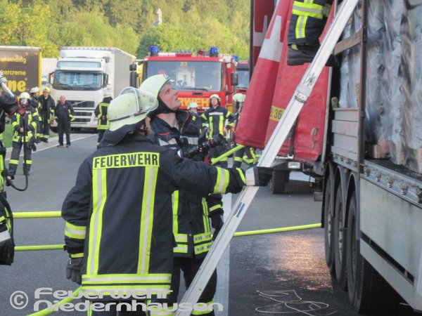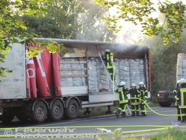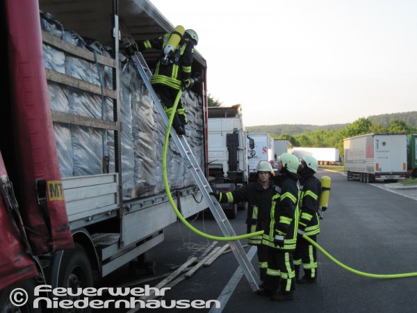 Gemeldet wurde ein LKW Brand auf dem Theisstalparkplatz Richtung Frankfurt. Vor Ort wurde festgestellt, dass Rauch aus dem Aufliger eines Sattelzuges drang. Der Fahrer hatte die Zugmaschine bereits abgekoppelt und einige Meter weiter geparkt. Die Ladung bestand aus aktivierter Kohle (Kohlenstaub) die in Säcken zu je 15 KG verpackt waren. 48 dieser Säcke bildeten eine Verpackungseinheit auf einer Palette. 4 Paletten hatten Feuer gefangen, wobei nur geringe Flammenbildung sichtbar war. Mit 2 C-Rohren des LF16 aus Königshofen und zwei Trupps unter schwerem Atemschutz wurde der Brand zunächst eingedämmt, bis ein Gabelstapler des Bauhofes Niedernhausen entraf, der die Palette vom Anhänger herunterhob, so dass diese abgelöscht werden konnten. Bei den Löscharbeiten wurde immer wieder Kohlenstaub aufgewirbelt, der das ganze Szenario in eine schwarze Wolke eintauchte. Im Einsatz waren ebenfalls die Kameraden aus Königshofen und Idstein.