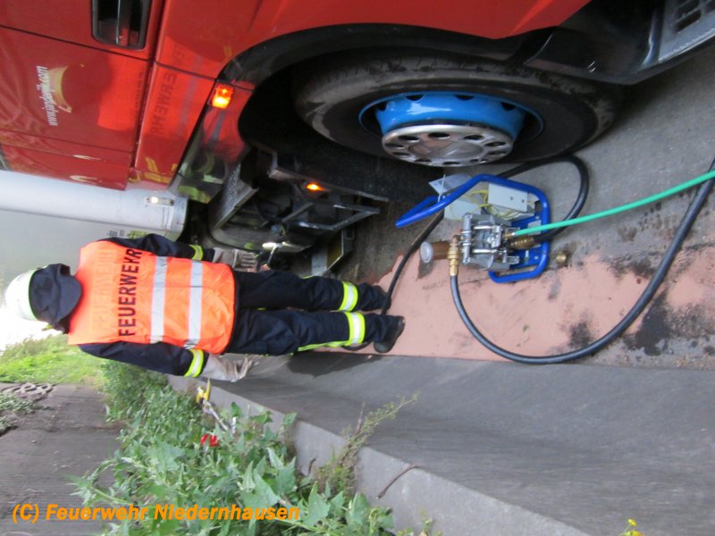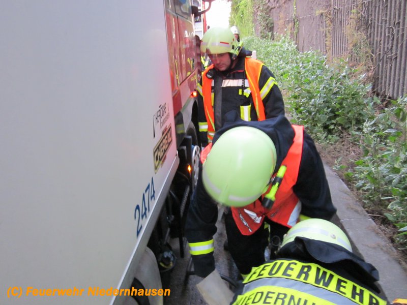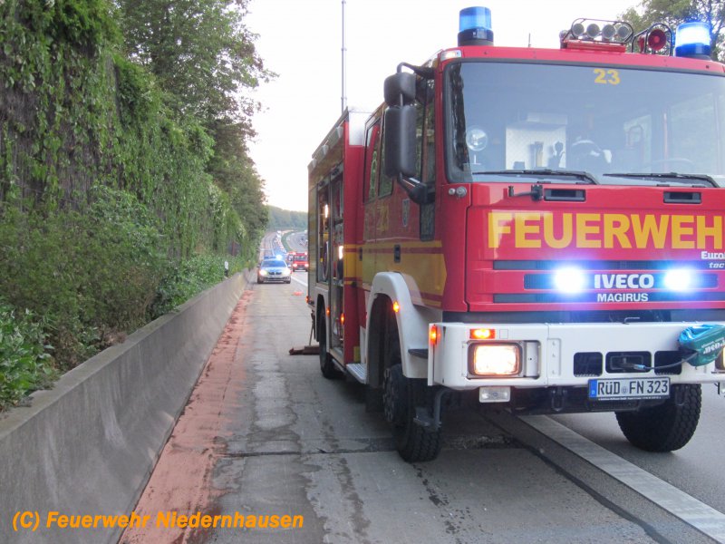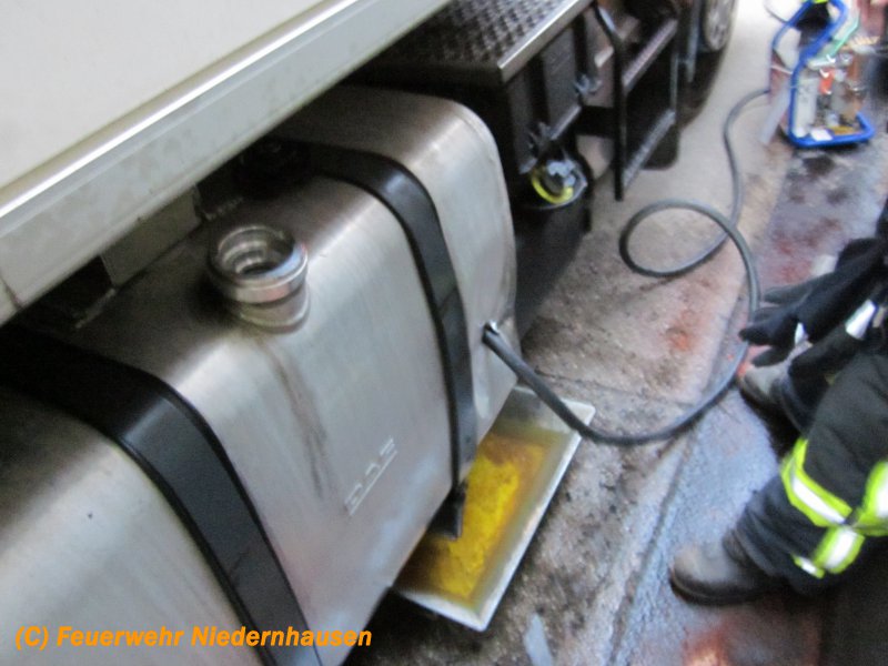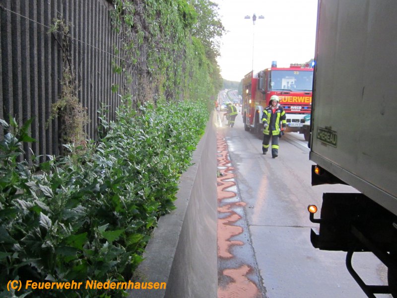 Ein LKW hatte in der Baustelle auf der A3 eine Warnbarke überfahren und sich dabei den Tank auf ca. 5cm aufgerissen. Ungefähr 200 Liter Diesel liefen in die Kanalisation, weitere 200 Liter wurden durch den GW Umwelt (FF Königshofen) aus dem Tank abgesaugt.