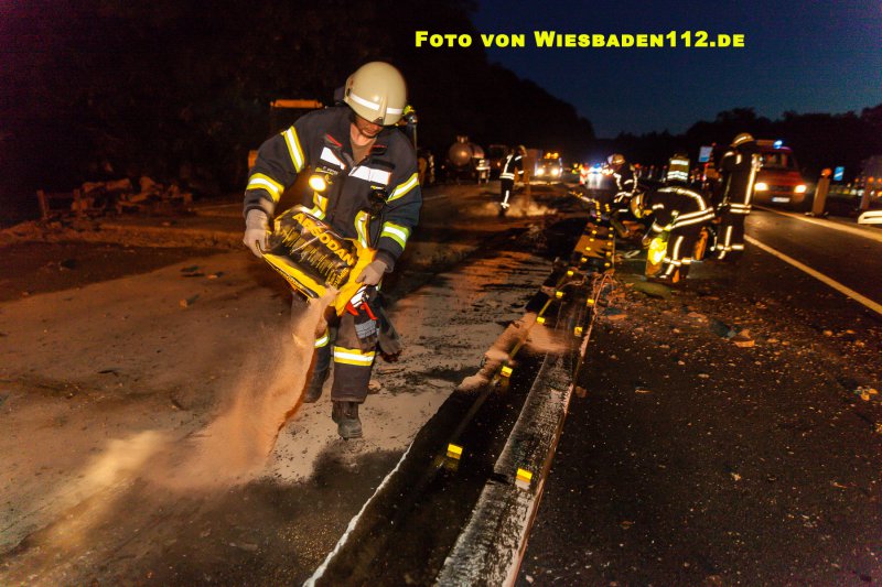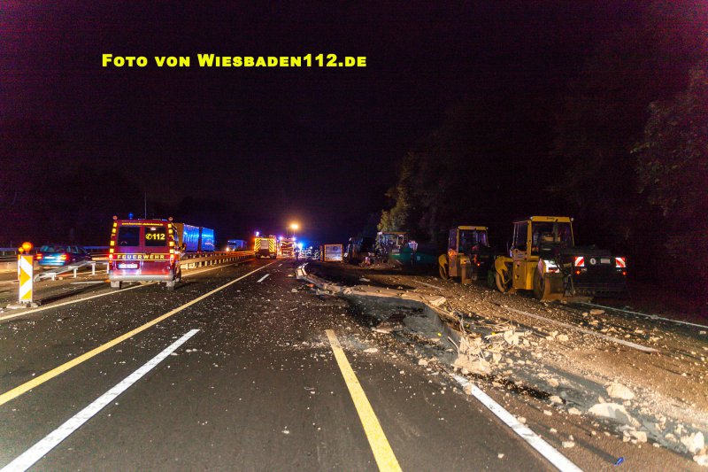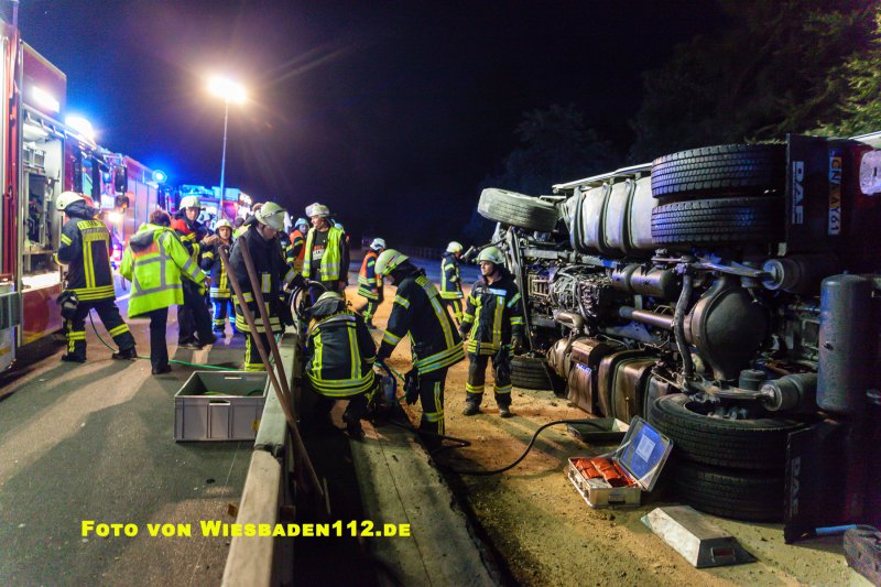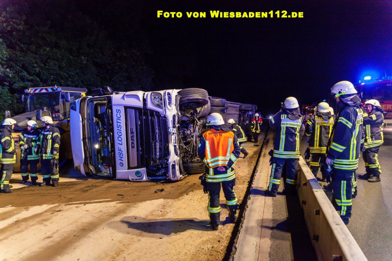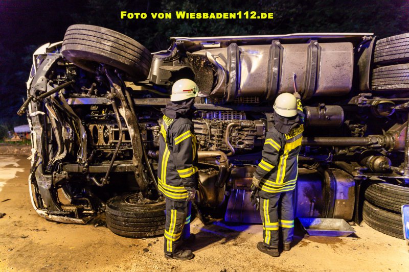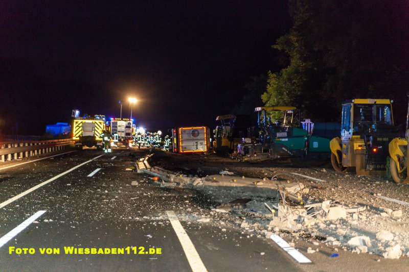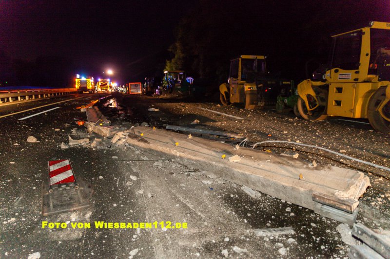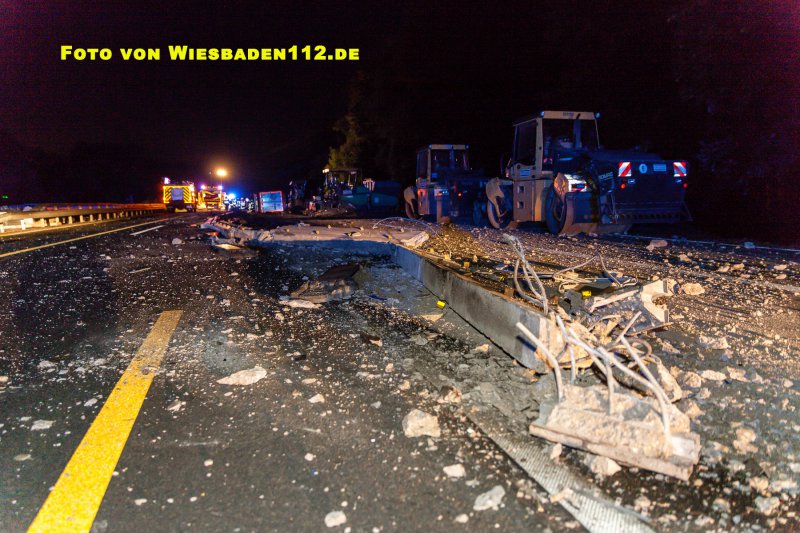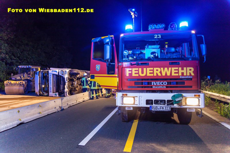 Aus bislang ungeklärter Ursache durchbrach ein LKW, in Höhe der Anschlussstelle Niedernhausen, die dort beginnende Beton-Fahrbahntrennung der Baustelle. Dabei stürzte der LKW samt Auflieger auf die Seite. Der Fahrer war noch im Fahrerhaus und wurde leicht verletzt über Leitern gerettet. Durch den GW Umwelt der Feuerwehr Königshofen wurden aus den Tanks mehrere hundert Liter Diesel abgepumpt. Ausserdem mussten großflächig ausgelaufende Betriebsstoffe mit Bindemitteln aufgenommen werden.