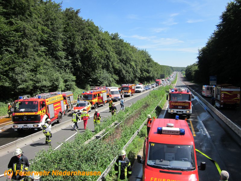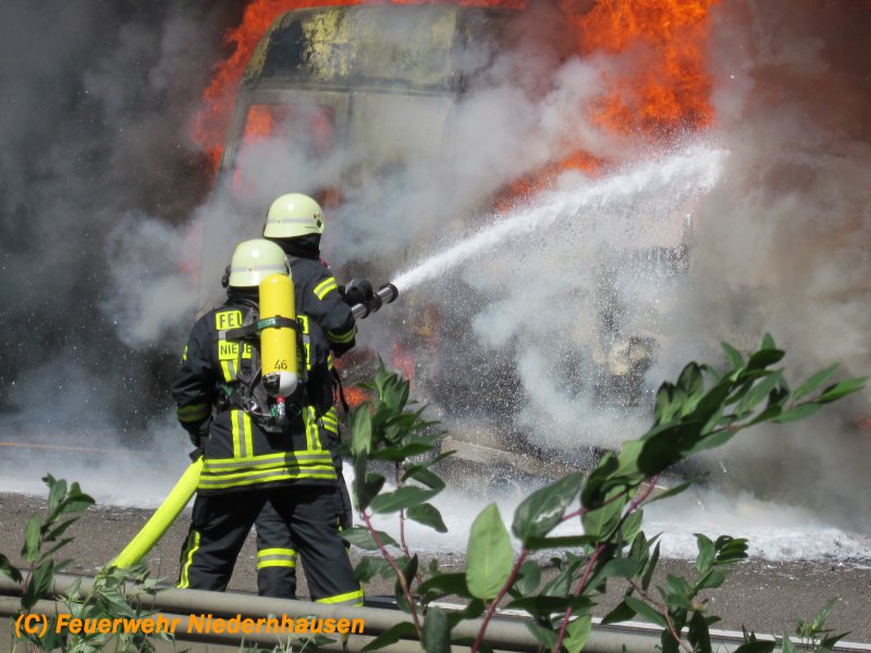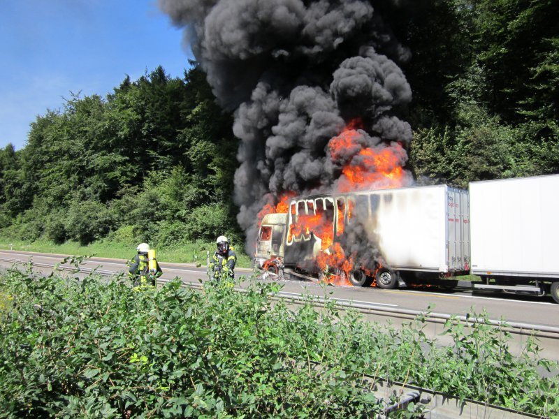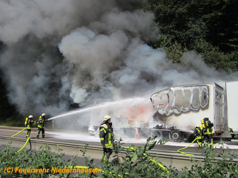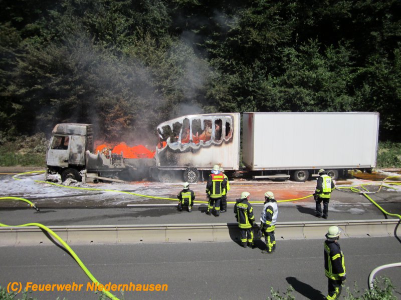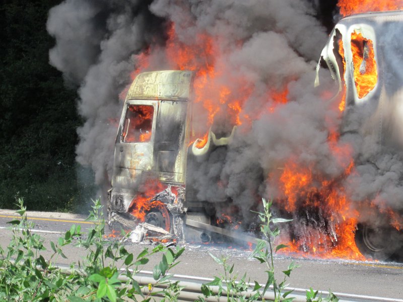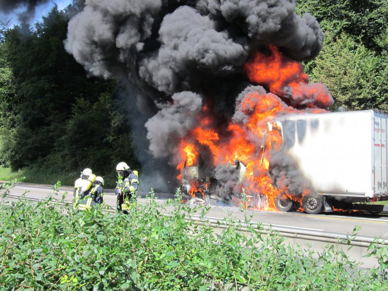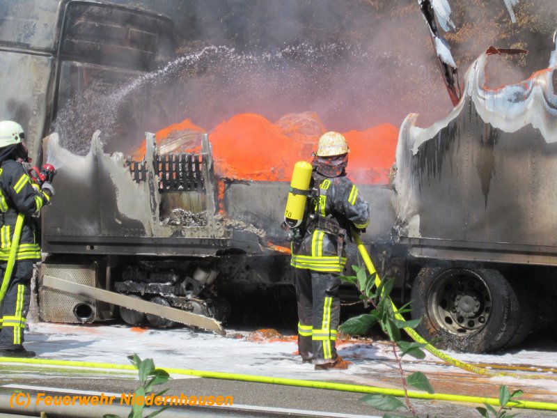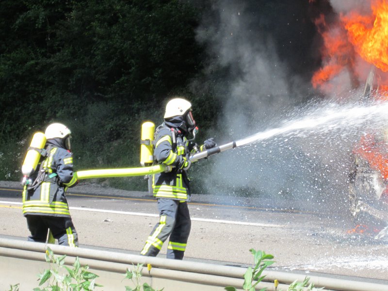 LKW Brand in voller Ausdehnung. Der LKW hatte Pigmentfarben in Pulverform geladen. 3 C-Rohre, 1 Schaumrohr, 13.000 Liter Wasser, 180 Liter Schaum und 6 Einsatzkräfte unter schwerem Atemschutz waren nötig, um den LKW zu löschen. Für die Dauer der Löscharbeiten musste die Autobahn in beiden Richtungen voll gesperrt werden. Es bildeten sich im Berufsverkehr kilometerlange Staus von bis zu 20 Km, die sich erst am sehr späten Abend auflösten. Die Anfahrt zur Einsatzstelle gestaltete sich aufgrund der Baustelle in diesem Bereich sehr schwierig, worauf der Einsatzleiter entschied, den Löschangriff von der Gegenfahrbahn vorzunehmen. Dazu mussten die Einsatzfahrzeuge durch den abgesperrten und neuasphaltierten Bereich der Baustelle fahren, wendeten an einer Ausfahrt für Baustellenfahrzeuge und erreichten die Einsatzstelle entgegen der Fahrtrichtung. Unterstützt wurden wir durch die Feuerwehren Königshofen, Idstein und Hofheim. Aufgrund einer falschen Ortsangabe wurden zunächst die Einsatzkräfte aus dem Rheingau-Taunus-Kreis alarmiert. Erst auf der Anfahrt stellte sich heraus, dass der LKW im Einsatzgebiet des Main-Taunus-Kreises stand, worauf auch Einsatzkräfte der Feuerwehr Hofheim in Marsch gesetzt wurden. Die Anfahrt der Feuerwehr Hofheim gestaltete sich in dem Baustellenbereich ebenfalls sehr schwierig, da die Fahrzeuge auf den 3 verengten Fahrspuren standen.