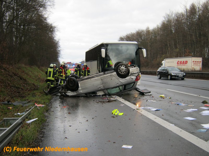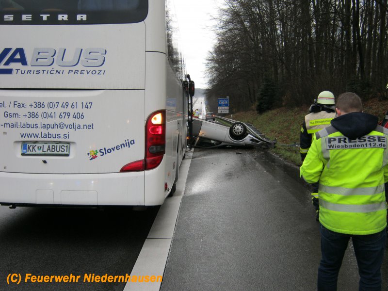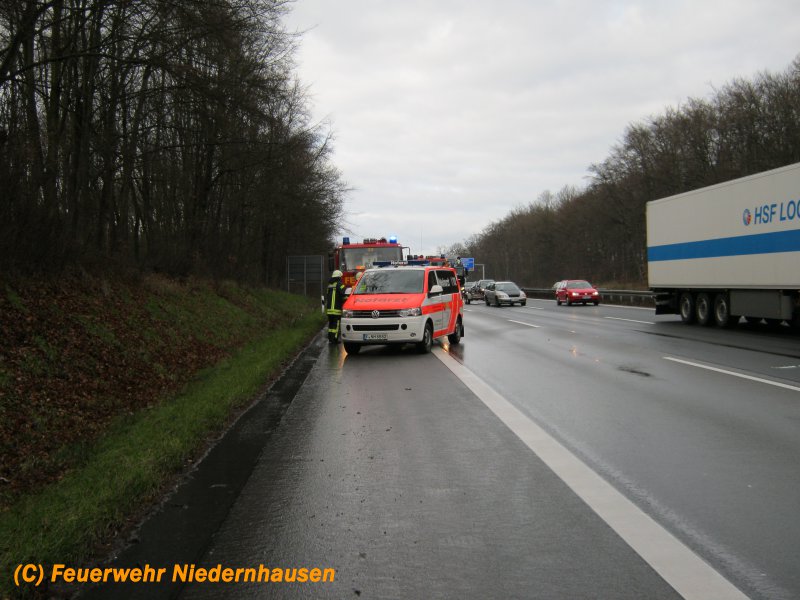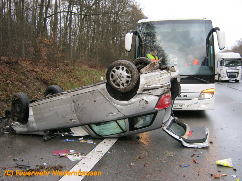 Auf der A3 kurz nach der Auffahrt Niedernhausen hatte sich ein Fahrzeug überschlagen. Die Insassen konnten noch vor Eintreffen der Feuerwehr über die Heckklappe und eine hintere Tür das Fahrzeug verlassen und wurde glücklicherweise nur leicht verletzt. Die Feuerwehr streute noch ausgelaufende Betriebsstoffe ab und sicherte die Unfallstelle.