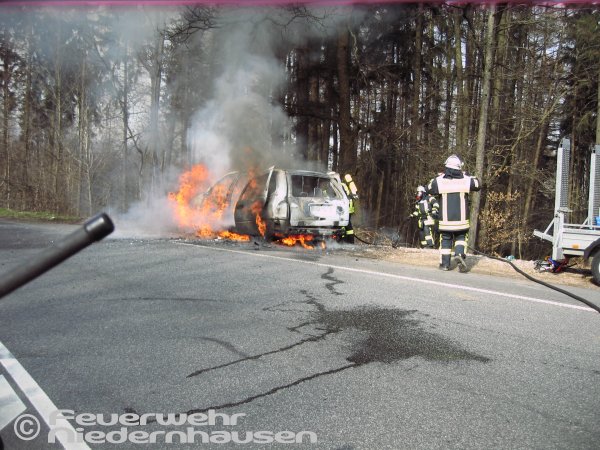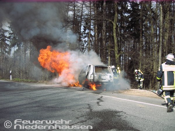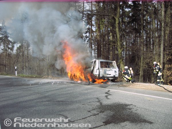 PKW in Vollbrand. Der Brand musste mit zwei Atemschutzgeräteträgern und 2 C-Rohren gelöscht werden. Aufgrund des brennenden Leichtmetalls kam es zu mehrere kleinen Explosionen.