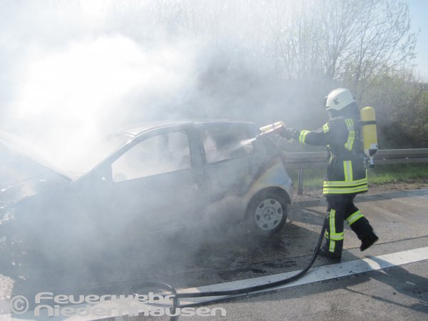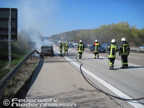 PKW in Vollbrand auf der A3 kurz vor raststätte Medenbach. Brand wurde gelöscht mit einem Trupp unter Atemschutz und einem C-Rohr.